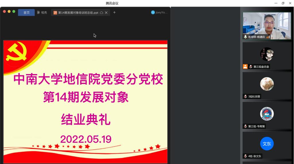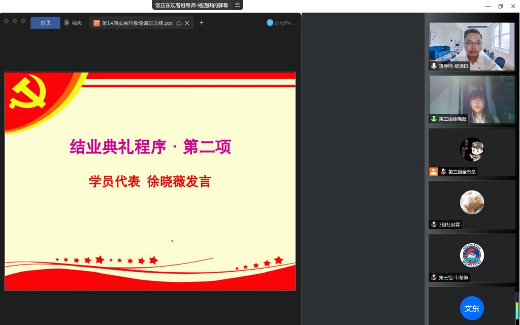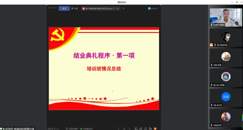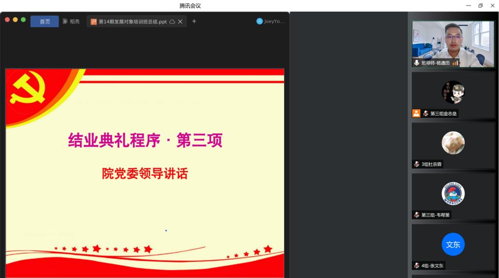 党委分党校第14期发展对象结业典礼以线上会议的方式顺利举行。本次结业典礼由培训班班导师杨通田老师主持,培训班全体67名学员参加。