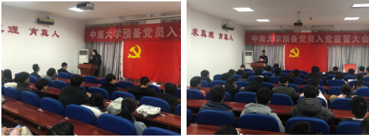 宣誓结束后,预备党员代表陆河顺子同志,老党员代表杨晨雨同志做了发言。陆河顺子对入党宣誓的意义进行了解释,体现了一名党员为实现个人价值所做出的无悔选择。杨晨雨同志通过一个故事讲出我们党是要全心全意为人民服务的,作为一名学生党员,我们要把党的宗旨牢记于心,尽自己所能帮助身边的同学。