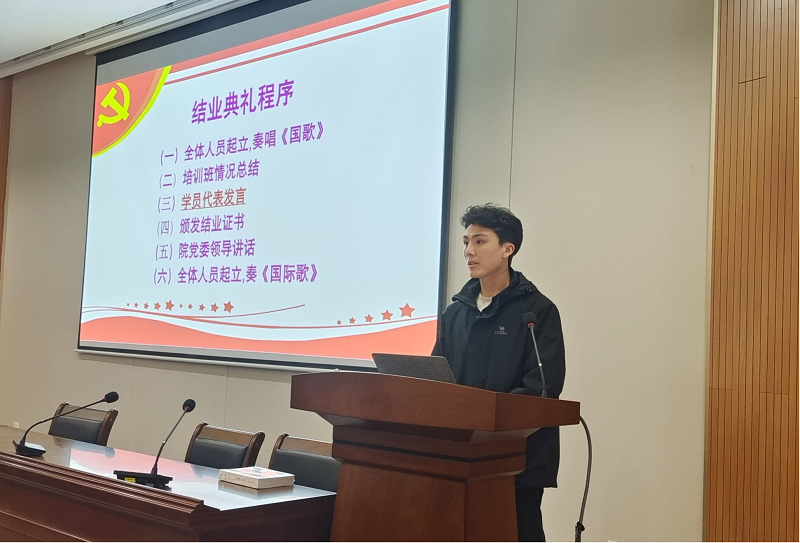 典礼第二项:冉应强同学作为优秀学员代表进行发言。冉应强同学分享他从党课中学到的理论知识,与同学们分享自己的学习体会,鼓励同学们在新时代中勇于担当,用实际行动诠释报国之志。