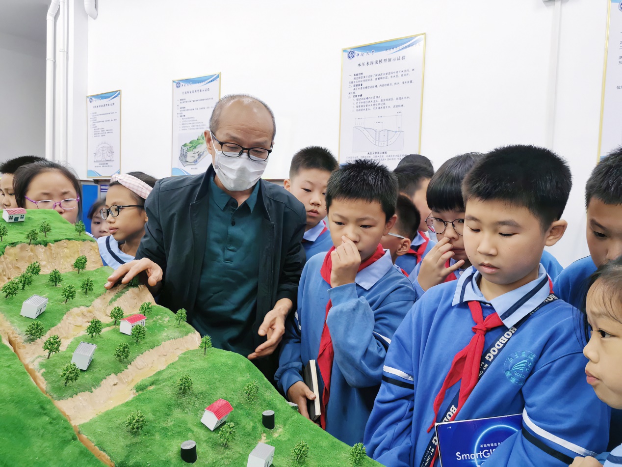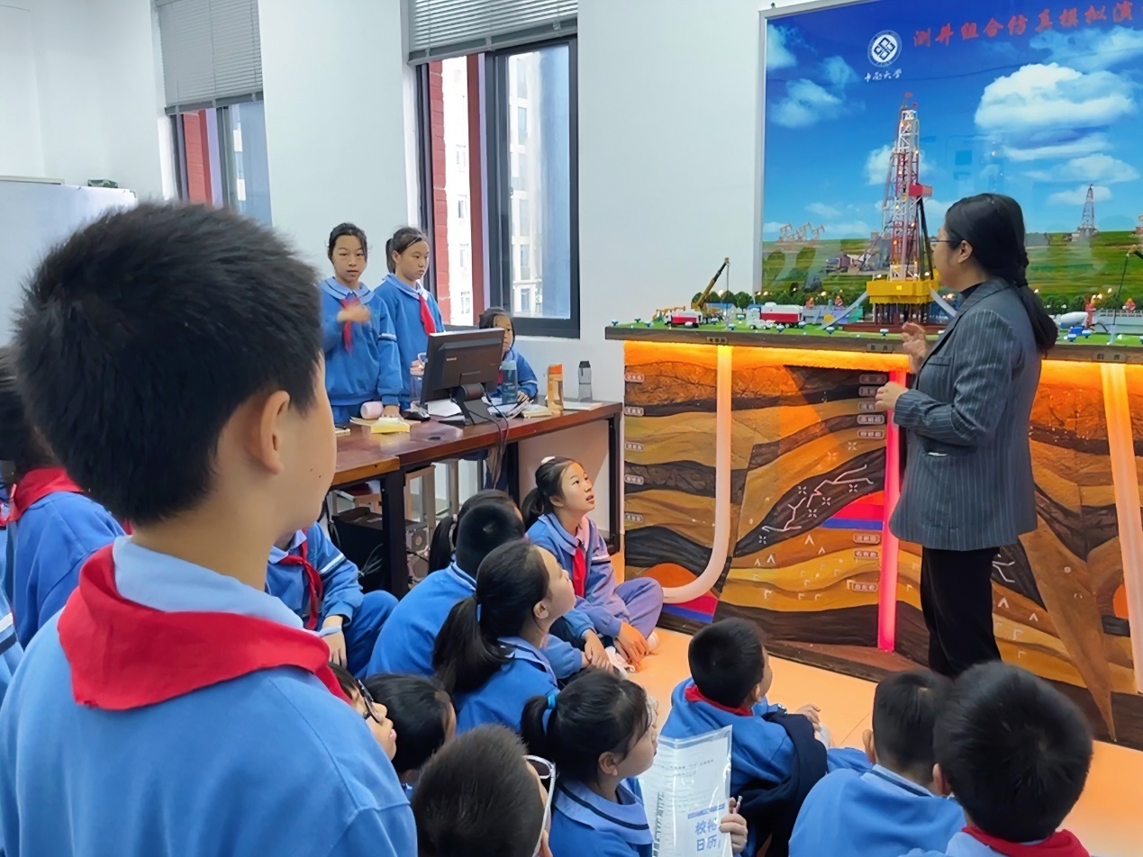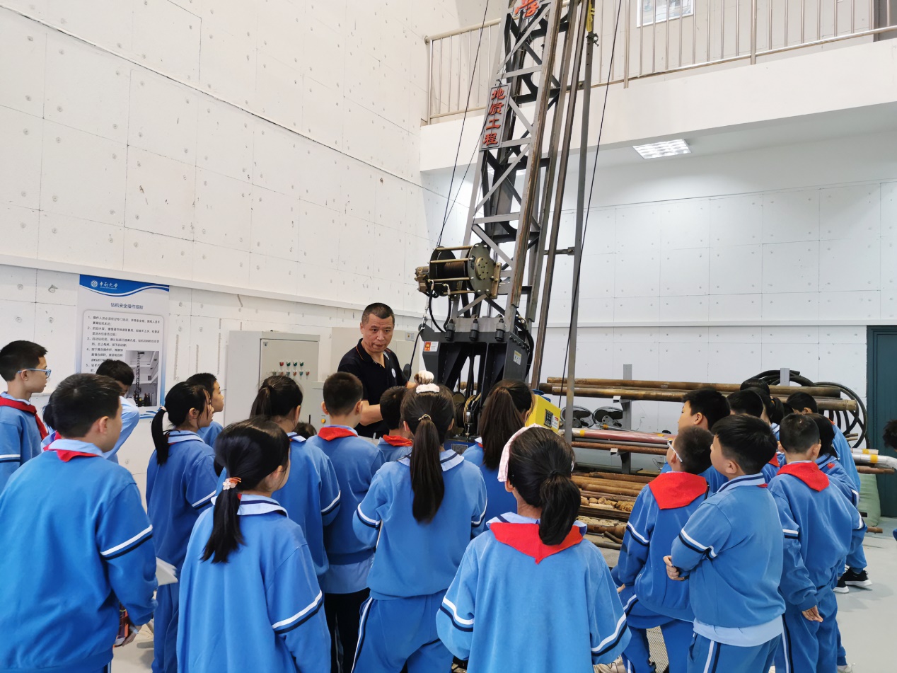 接着孩子们跟随裴老师了解了地球物理测井的方法和发展历程;跟随易老师了解了探测无人机;跟随匡老师了解了典型地质灾害的成因和危害,引导孩子们保护地质环境;最后跟随刘老师来到了钻探工程实验室,了解了深地钻机的结构及工作原理,刘老师实际操作钻机,让孩子看到了模拟采集地球深部岩心岩样的过程。