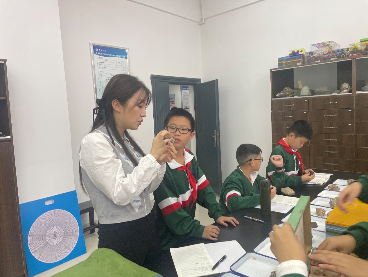 第二站,同学们来到了矿物学及岩石学实验室。地质学专业的毛老师和沈老师为同学们上了一堂丰富多彩的地质课。两位老师带领小朋友们从矿物的颜色、硬度、光滑程度、磁性等方面认识各种各样的岩石和矿物。同学们全神贯注倾听,有些同学还认真地做了笔记。