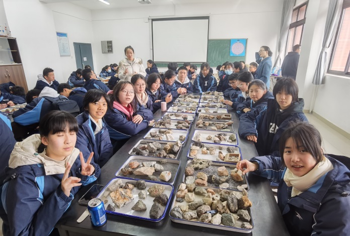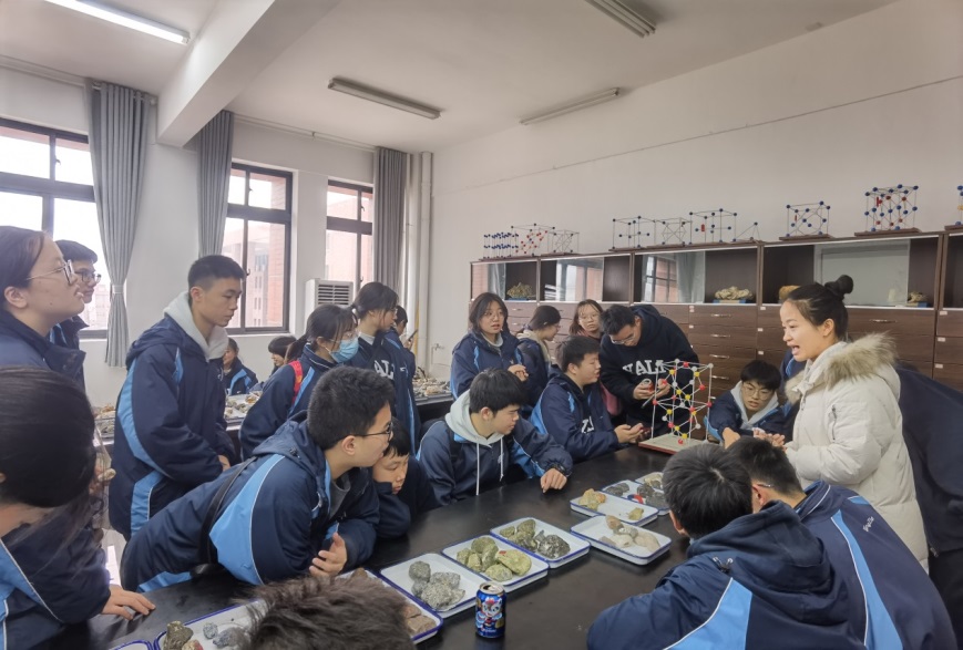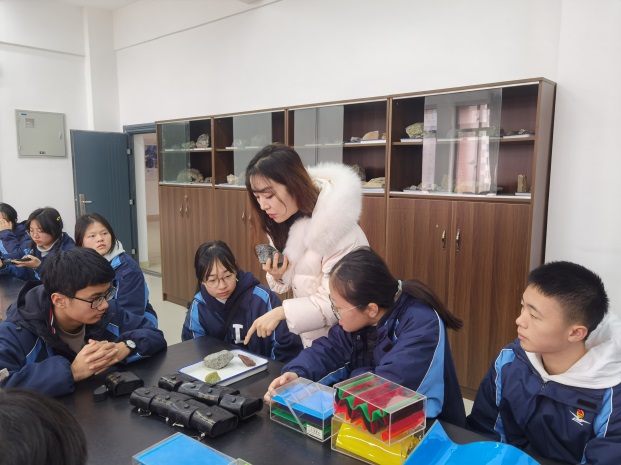 接下来,学生们参观了矿物学及岩石学实验室。在实验室老师的讲解中,他们进一步了解了岩石的结构及用途。展馆内展示了各类岩石模型,学生们可以近距离观察到各种奇妙的矿物岩石,感受自然的鬼斧神工。