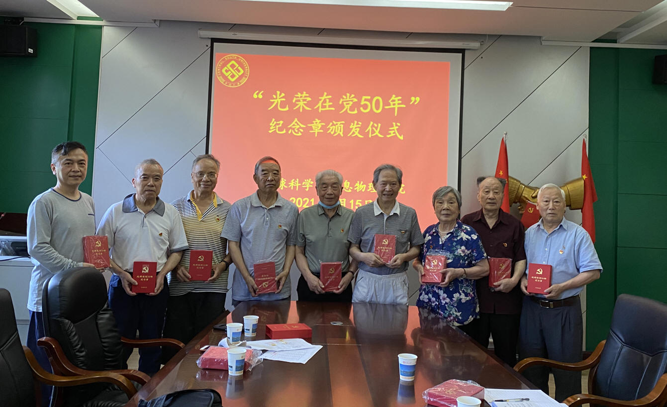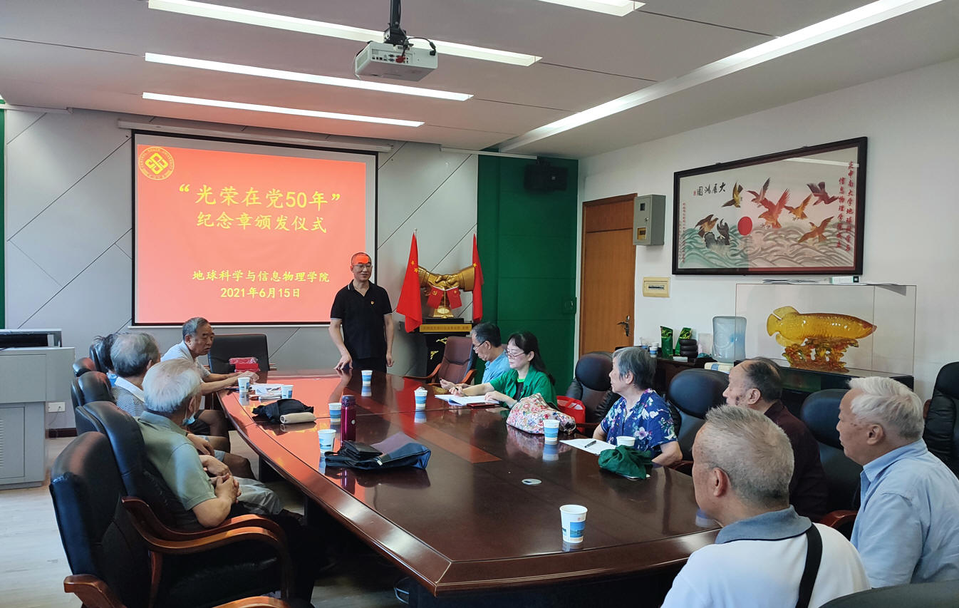党委在地学楼336会议室举行 “光荣在党50年”纪念章颁发仪式,邵拥军书记向余行祯、李荣刚、胡应藻、陈惜华、蔡光顺、鲍光淑、任荣恩、刘水源、何凭宗、胡祥昭、李光炽和陈正阳等12名老党员颁发了“光荣在党50年”纪念章。