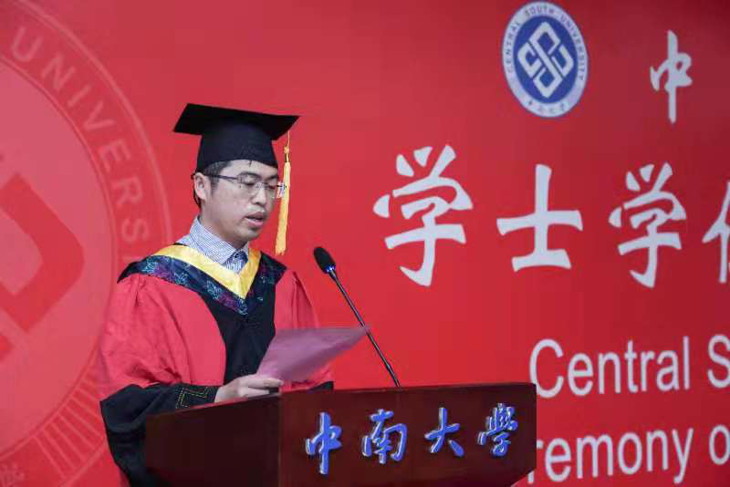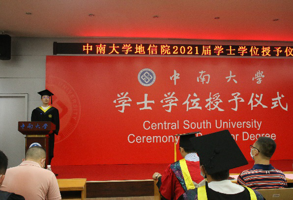 接下来,在副院长邹滨宣布拟授予学士学位的学生名单后,优秀学生代表遥感1701班薛琛昊发言,他回忆了这四年里与中南、与地信、与同学相处的点点滴滴,自己对于明升M88
