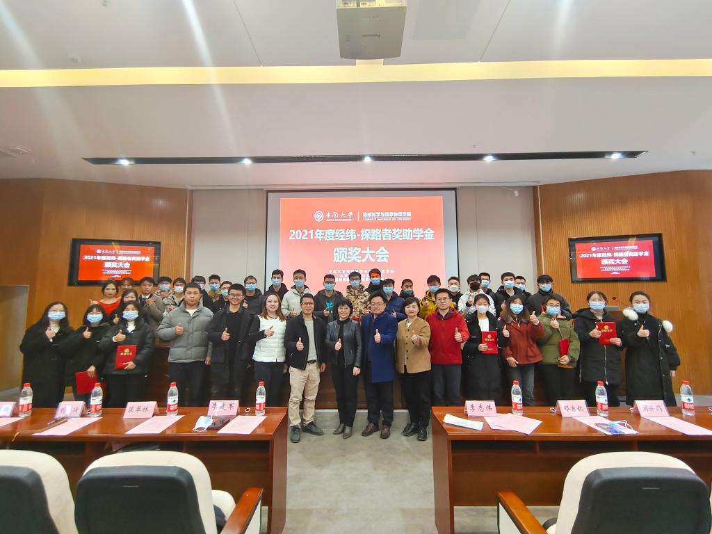 2021年度经纬-探路者奖学金获得者及受资助学生名单,共计博士研究生两人,硕士研究生两人,本科生获一等奖六人、二等奖十人共十六人,助学金获得者共十人。名单宣读后,李建军副书记、李志伟副院长、匡翠林老师和邓吉秋老师为获奖学生颁奖。