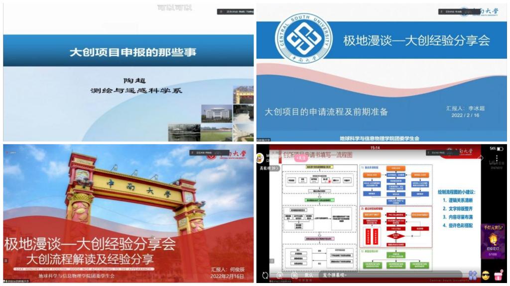 教授、博士生导师陶超老师,遥感1801班的何俊辰同学及地质类卓越1801班的李冰超同学。老师和两位同学在大学生创业创新项目上均有丰富的经验,他们结合自身经历与实际情况,分别从大学生创业创新项目的内涵与意义、大创项目团队的组建、项目的申请流程以及前期的准备工作与注意事项等多个方面为同学们进行了方法指导与经验分享。分享会后同学们纷纷反映讲解清楚、收益颇丰、相关疑问得到了很好的解答,也为同学们后续参与大学生创业创新项目指明了方向,增添了信心。