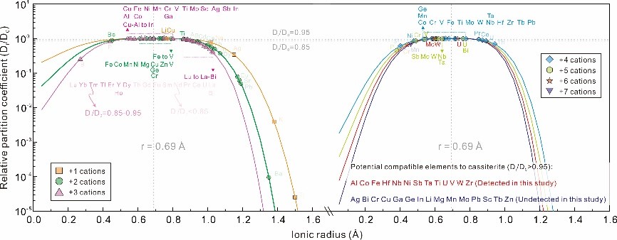 (2)锡石微量元素理论相对分配系数的首次计算:由于已有的文献报道了锡石中共计高达56种微量元素的含量,但这些微量以何种形式存在于锡石中仍然未知,因此,确定各微量元素在锡石中的分配系数是解决这个问题的关键。本研究首次通过晶格应变模型(lattice strain model)计算了锡石中目前已报道的微量元素的理论相对分配系数(图2),认为某些已报道的元素不相容于锡石(如K、Ag、Ba、Sr、LREE等),可能以微小矿物/流体包裹体的形式存在于锡石中,因此未来的研究对于锡石微量的解释需要谨慎。