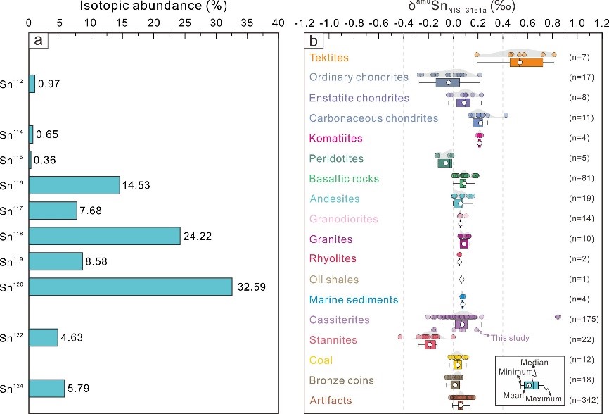 图1 (a)锡同位素丰度与(b)锡同位素储库组成