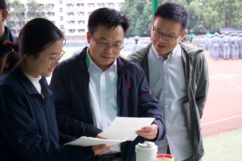 党委副书记刘浩及2024级新生辅导员寇浚哲、王爽爽每天在训练场边,密切关注学生身体情况与军训进度。明升M88