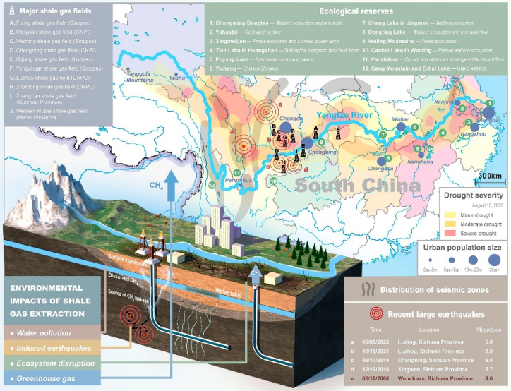 我国页岩气资源十分丰富且发展迅速:可采资源潜力位居世界第1位,年产量已超250亿立方米/年,位居世界第2位。然而,当前页岩气开发利用广泛使用水平钻井和水力压裂技术,为实现2030-2035年页岩气年产量达到800-1000亿立方米的目标,根据美国的开发经验,预计我国页岩气主产区开发井的数量将达上万口。我国页岩气主产区经济发达、人口密集、地质条件复杂、生态多样性显著,必须高度重视大规模页岩气开发可能带来的潜在影响。针对潜在挑战,研究团队提出了三方面解决方案。(1)建立全周期环境监管体系,重点强化甲烷泄漏实时监测、压裂废水循环处理及地震风险动态评估;借鉴国际经验,在高风险区域试点 “分级响应机制”,根据地质活动强度实施差异化管控措施。(2)推动技术创新与产业协同,倡导产学研深度合作,研发 CO₂无水压裂液、智能钻井装备等绿色技术,降低30%以上水资源消耗以及碳排放;通过设立行业创新平台,加速纳米级页岩储层吸附机理等基础研究成果转化,提升开发效率并减少生态扰动。(3)实施区域生态安全评估与规划,在长江经济带开展生态脆弱性分区管理,将页岩气开发纳入 “双碳” 目标考核体系;建议建立涵盖水资源承载能力、地质灾害风险、生物多样性影响的多维度评估模型,确保开发强度与生态保护红线相协调,助力实现联合国可持续发展目标。