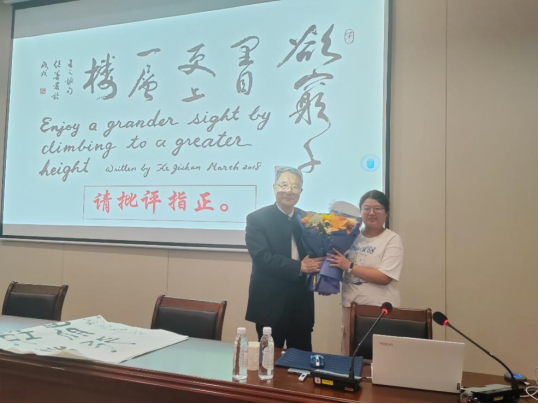 进入首批“211工程”行列的奋斗历程。何院士最后用“欲穷千里目,更上一层楼”的书法作品鼓励在座的同学们,勉励学子永葆“将科技红旗插上世界高峰”的斗志,既要传承中南物探人“敢为天下先”的精神,更要铭记历史、胸怀家国。报告在师生们热烈的掌声中结束。