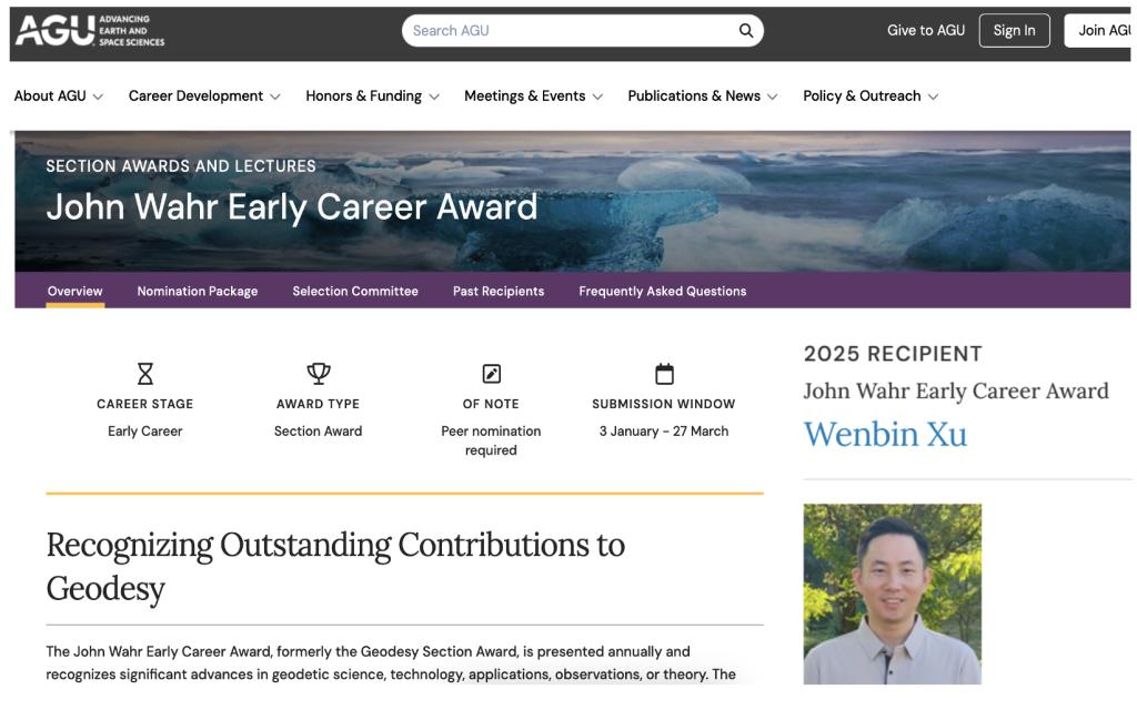 许文斌教授 “John Wahr 青年科学家奖”(John Wahr Early Career Award),以表彰他在大地测量领域的理论创新、技术突破与应用实践中取得的卓越成就,尤其肯定其在雷达干涉测量(InSAR)地壳形变观测理论与技术方向的创新性贡献。