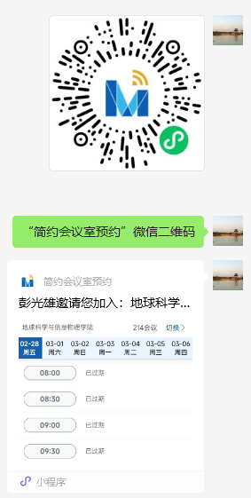 发送的“简约会议室预约”微信小程序(或扫码)进行预约登记,会议室基本情况和使用说明分别见附件1和附件2;