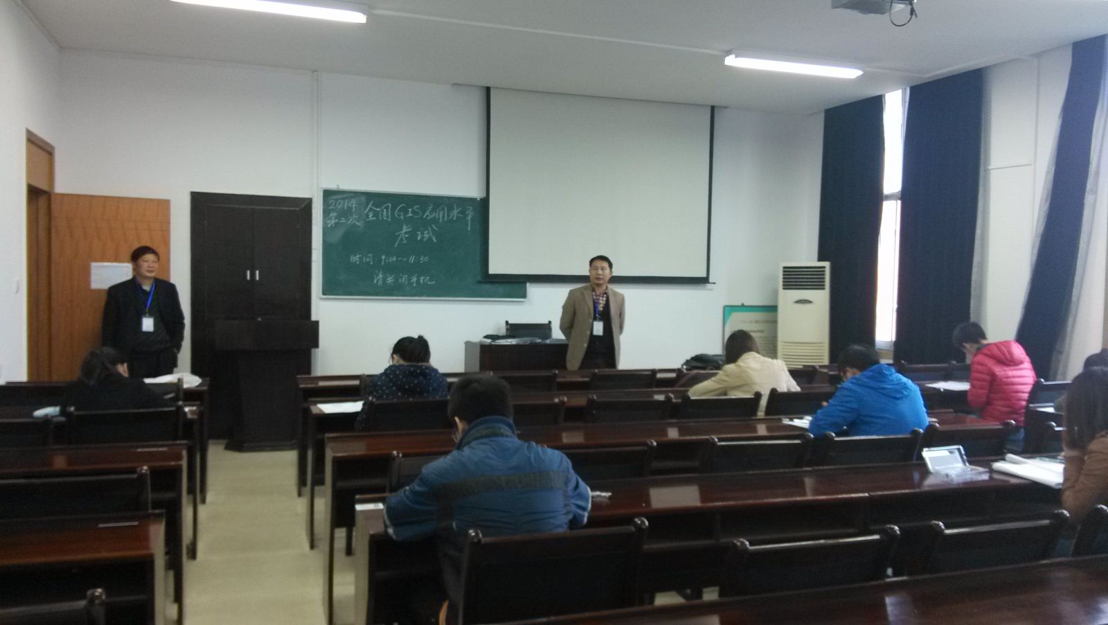 副院长刘兴权教授现任全国GIS应用水平考试委员会常务副主任委员,地理信息系毛先成教授担任副主任委员。考试委员会对考试工作高度重视,考试期间副主任委员毛先成教授特意前往考场巡视。