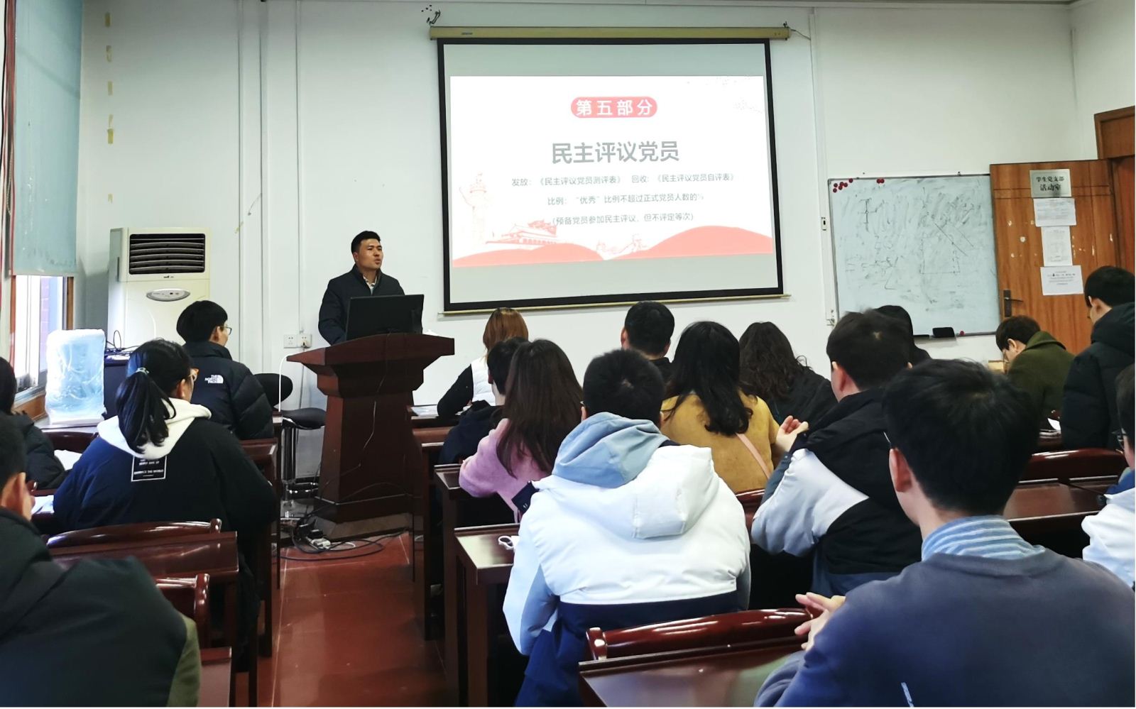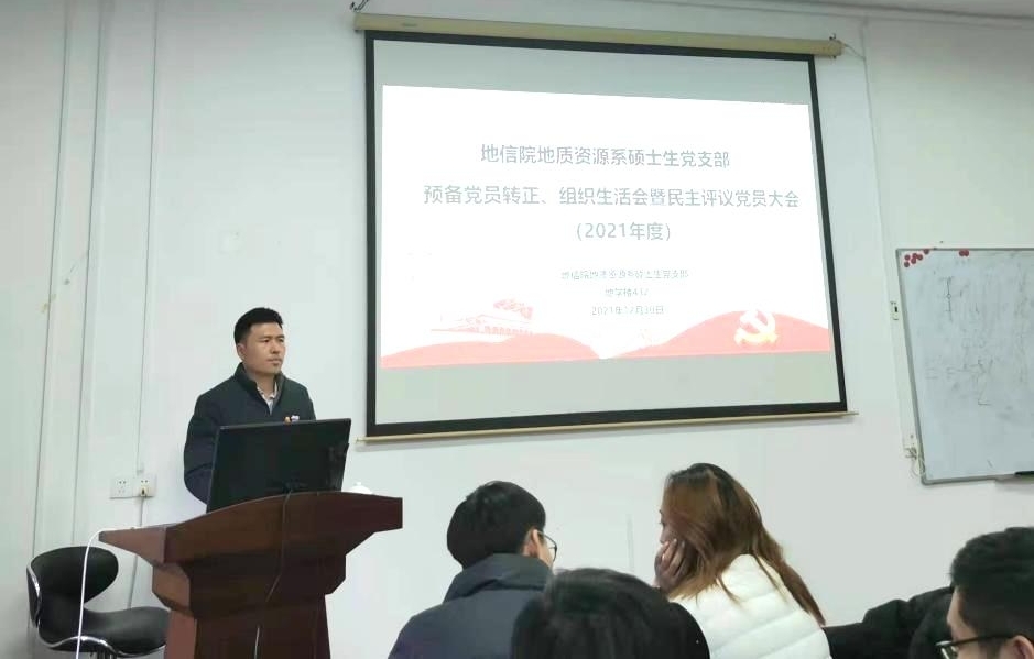 地质资源系硕士生党支部于2021年12月30日下午在地学楼432教室顺利召开了预备党员转正、组织生活会暨民主评议党员大会。大会由党支部书记康逊老师主持,支部副书记李永顺组织并负责,支部党员、预备党员等共46人参加此次活动。