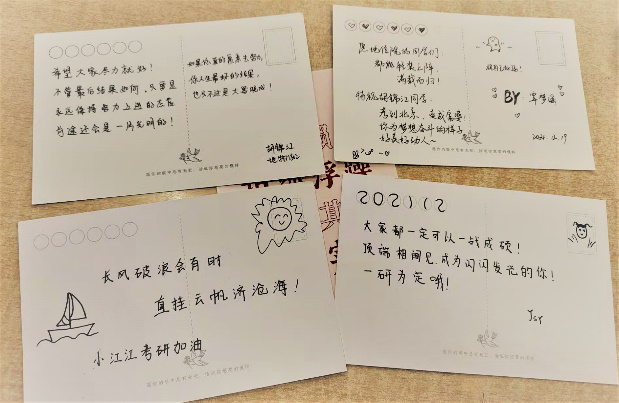 会议伊始,每位同学在明信片上写下想对自己或其他考研同学说的祝福话语并放入抽奖箱中,随后李建军书记和强俊老师抽取十张幸运同学赠予心意礼物一份。接下来,强俊老师对同学们的积极备考、辛苦复习表示高度的赞扬,动员同学们要劳逸结合,适当放松,不要焦虑、紧张,在仅剩的五天时间内不要高强度学习,重在调整作息与心态,把心态放平才能用更好的思想答题。同时,他鼓励全体考研同学“一战成硕”,并表示对同学们顺利上岸充满了信心。最后,李建军副书记就考研事项进行了强调,同时以毛泽东“在战略上藐视,在战术上重视”之言寄予同学们殷切的期望,以“衣带渐宽终不悔,为伊消得人憔悴”之境赞扬同学们的努力,以“众里寻他千百度,蓦然回首,那人却在灯火阑珊处”祝愿中南地信人考出正常水平,考试一切顺遂。