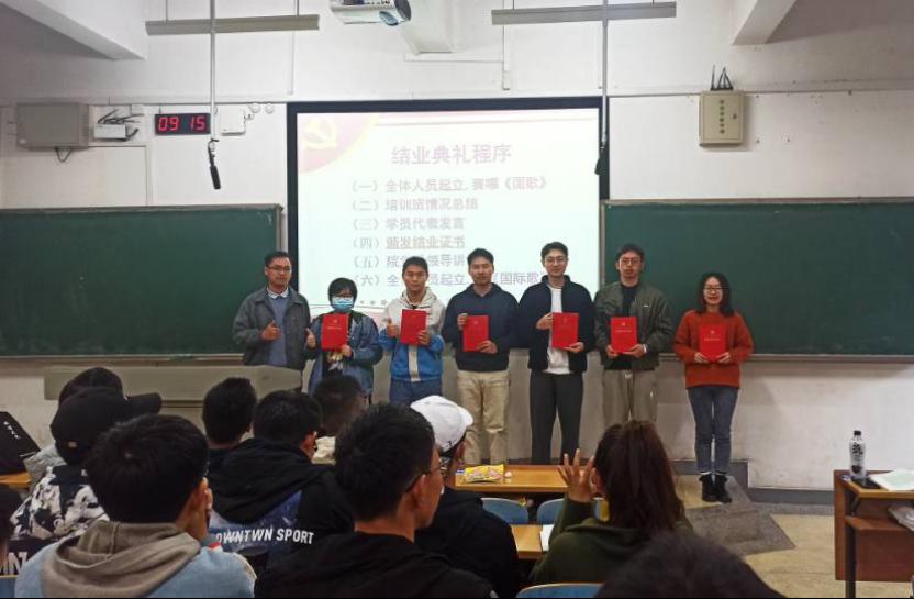 在本次结业典礼上,杨老师专门带来了一批《纪念中国共产党成立100周年党员学习笔记》,用来奖励本次培训班中表现突出的同学。杨老师亲自颁发了纪念奖品,并号召大家向这些优秀同学学习。接下来培训班各个小组分别上台领取结业证书并合影留念。