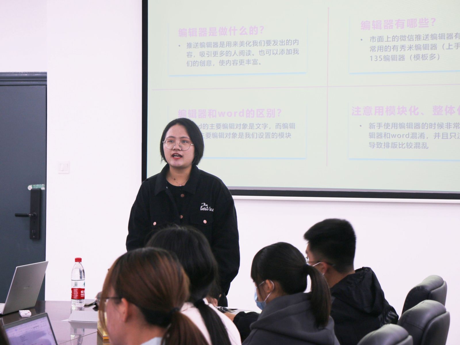 会议伊始,何可沁老师对蔡俊涵和王怡星同学的到来表示感谢和欢迎。接着蔡俊涵同学就基础知识、构图思路、会议记录和调色思路四个角度展开摄影技能的培训。他详细地讲解了在学工活动和新闻记录工作中需要运用到的摄影技巧和需要注意的问题,并对拍摄中常犯的错误加以提醒和强调。在讲解最后,蔡俊涵对同学们的现场提问做出了积极解答,加强了同学们的学习效果。随后,王怡星同学就推送的排版与设计做相关技能培训。她对排版结构、风格基调、素材运用、发挥创意等四个板块做了详细的说明,指出排版时需要运用到的方法和应该注意的各种问题。在此期间,王怡星用电脑示范操作,让同学们有了更加直观的认识,之后,她就同学们的往期推送提出了相关建议,使同学们可以做出更具针对性的修改。