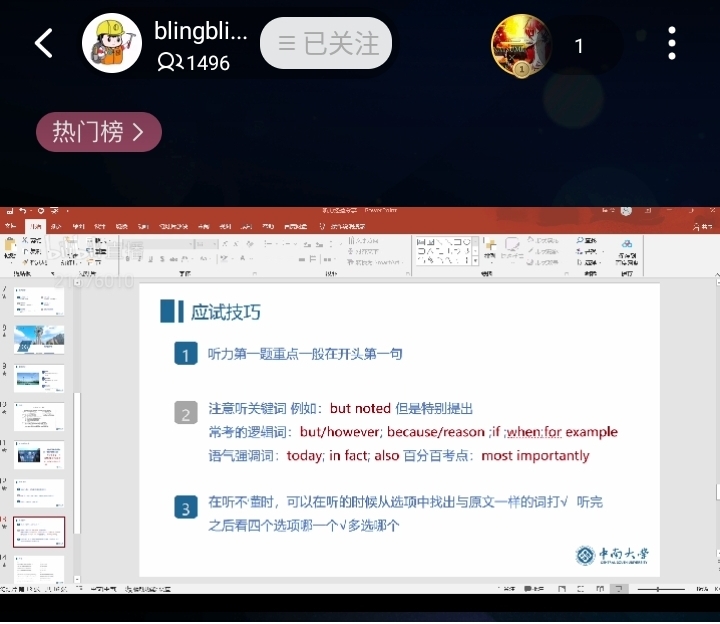 “极地漫谈”系列之英语四级经验分享会圆满结束。在此次直播过程中,同学们积极提出了自己的疑问并得到了高质量的回复,相信同学们都在本次分享会中收获到了关于备战四级考试的方法和四级考试的应试技巧。此次直播观看人数高达1496人次,这充分体现了同学们对于四级考试的重视,以及对于学习的高度热忱。最后,祝愿每一位同学都能在即将到来的四级考试中取得优异的成绩!希望在极地漫谈系列活动的进行下,地信学子能继续提高自己的能力,勇担时代重任!