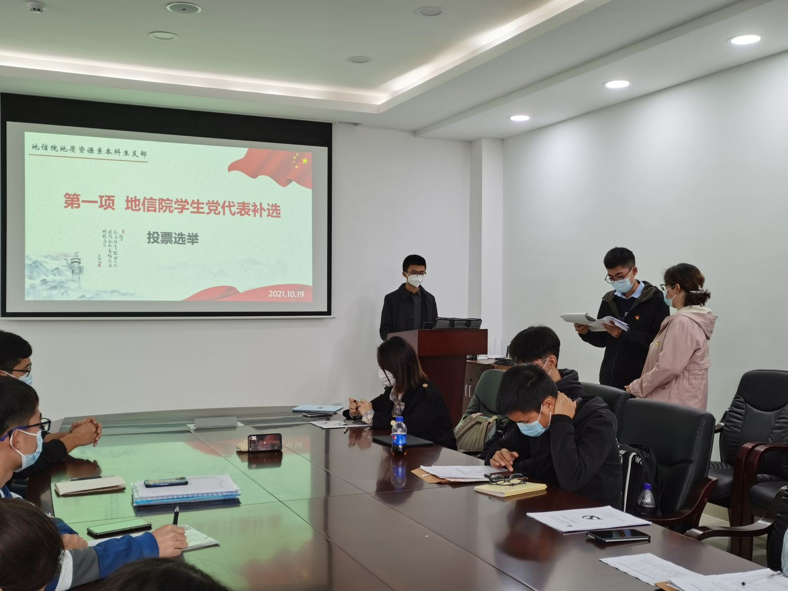 学生党代表补选。由郝舒蕃、何玲担任监票人和计票人,郝珈瑶宣读投票规则,到场的8位党员投票选举。本着公开公正透明的原则,选举所有过程现场进行,最终确定杨晨雨和李世相为补选代表预备人选。
