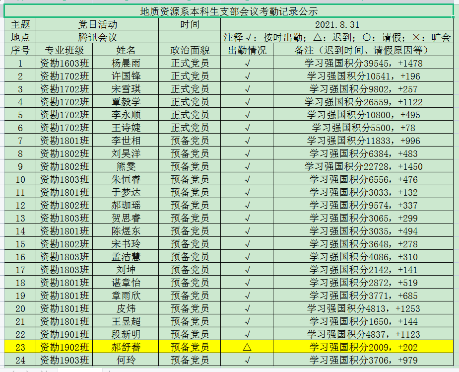 8月31日下午15:00,地质资源系本科生支部八月主题党日活动通过“腾讯会议”软件顺利召开。会议由何玲同志主持,地质资源系本科生支部全体同志参加。