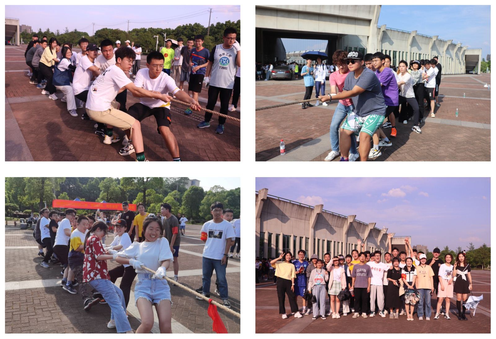 第一轮比赛开始前,各班级同学开始进行热身,大家都精神抖擞,充满热情。比赛开始后,各个班级轮番上阵,热火朝天,参与拔河的同学气势如虹,齐声高喊着口号,双手紧握麻绳,双脚用力着地,身体微向后倾,所有人齐心协力凝成一股绳!场下的同学也情绪高涨,呐喊声、加油声此起彼伏,给比赛增添了一抹亮色,每一声呐喊都带来一股力量!经过一个多小时的激烈比拼,最终地信类2005班拔得头筹。