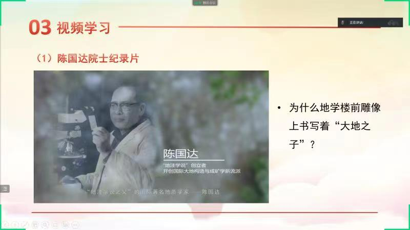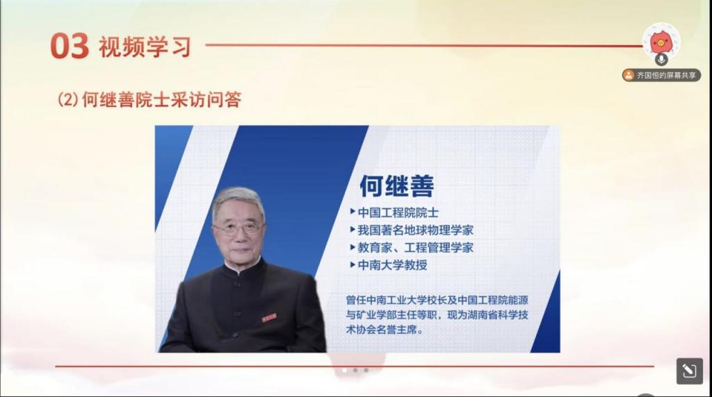 会议第三项,由齐国恒同志主持开展12月份的集体学习。学习内容为集体观看陈国达院士纪录片以及何继善院士的采访视频。