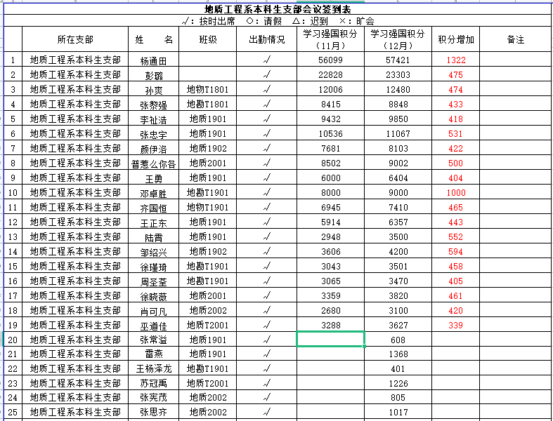 会议第一项,由组织委员张忠宇同志进行应到参会同志签到及学习强国积分统计。