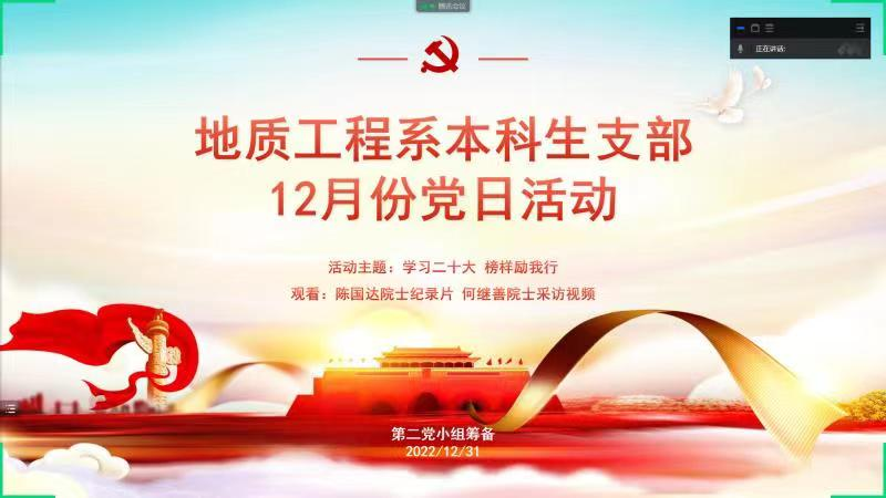 地质工程系本科生支部于线上腾讯会议开展了“学习二十大 榜样励我行”十二月党支部党日活动。会议由第二党小组组长齐国恒同志主持,支部书记杨通田、支部全体同志参加本次支部大会。