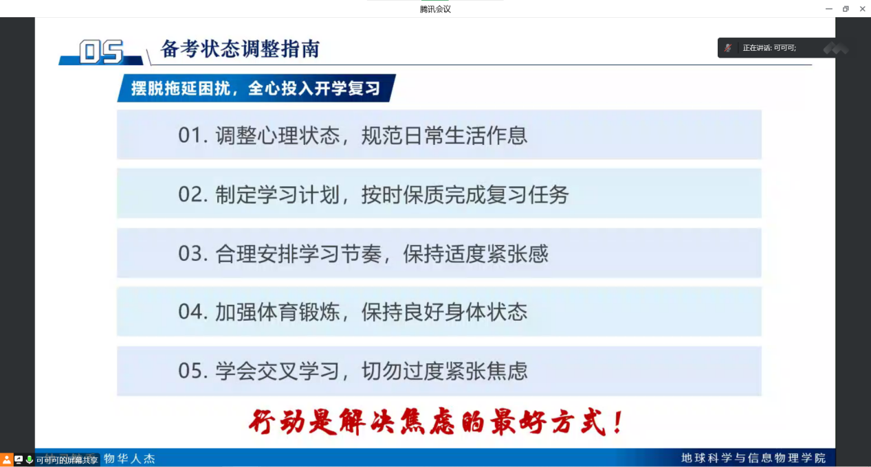 的考试安排,提醒同学们参与年级课程辅学、寒假特色活动,鼓励同学们应当积极参与到寒假打卡、线上云自习等活动中来。接着刘琦老师希望同学们都能尽快摆脱拖延困扰,全心投入开学复习,并给出了五点建议:调整心理状态,规范日常生活作息;制定学习计划,按时保质完成复习任务;合理安排学习节奏,保持适度紧张感;加强体育锻炼,保持良好身体状态;学会交叉学习,切勿过度紧张焦虑。会议最后,刘琦老师希望大家一起努力并祝愿同学们顺利完成考试,取得优异的成绩。