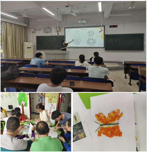 在活动开始前,爱心同盟对参与成员进行了必要的拼花技巧培训,以便参与活动的社团成员了解活动的流程及注意事项。活动当天,简单分组后,成员们共同出发前往慧灵活动中心。到达慧灵服务中心后,李老师向爱心同盟成员介绍了慧灵的基本情况和注意事项,随后活动正式开始,志愿者们按照策划方案与学员们一起进行了花草拼贴、折纸和剪纸等一系列活动,彼此交流互动。活动尾声,志愿者给每一幅作品贴上小红花以作纪念。本次活动在成员们的努力以及慧灵学员的配合下顺利结束。