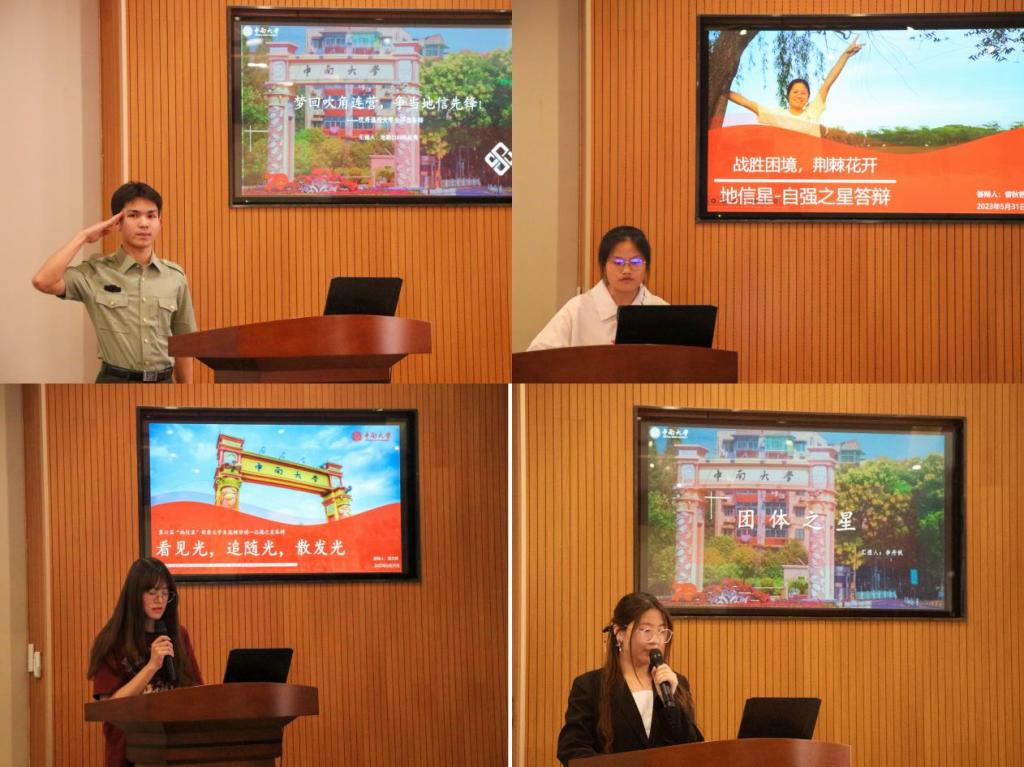 随后,18位集体和个人依次按抽签顺序进行答辩展示。各位选手分别从自身思想道德、学习综合表现、创新创业成果、文体活动、志愿服务等方面对自身进行了多方位展示,突出自身特色。每位选手答辩后,评委老师都对他们的专项成果提出了针对性的问题,进行了更加深入的交流和更细节的展示。答辩环节结束后,刘琦老师进行赛后总结,对参会的老师和参加答辩的各位学生表达了感谢,她希望在场的每一位同学都能汲取榜样力量,在将来成为当之无愧的地信之星,将榜样力量接续传承!