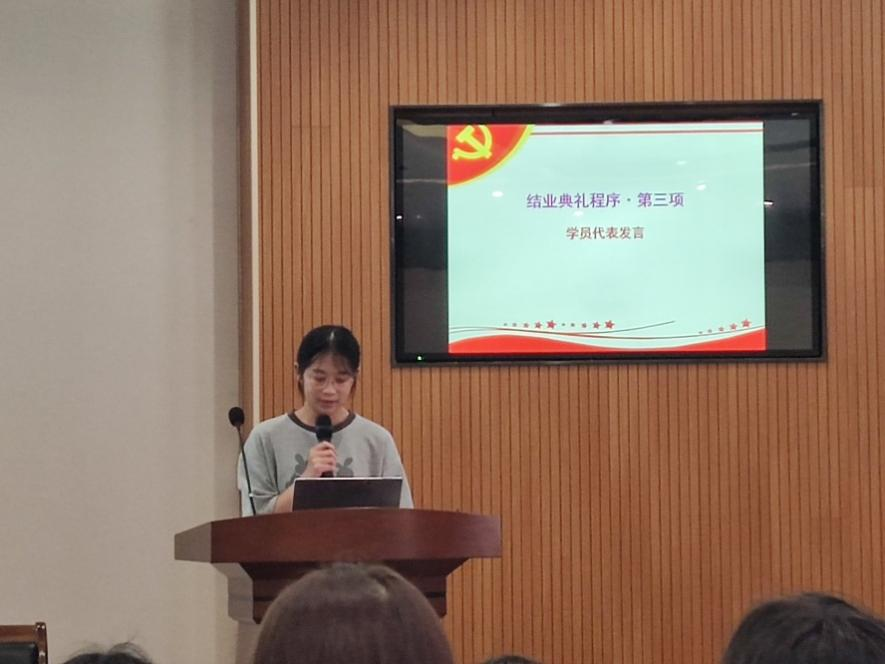 典礼第四项:院党委领导讲话。学员代表发言结束后,杨通田老师受院党委领导委托讲话。他首先对培训班的基本工作表达了肯定,同时也对学员们表达殷切的期望,希望同学们以共产党员标准严格要求自己,争取早日入党。