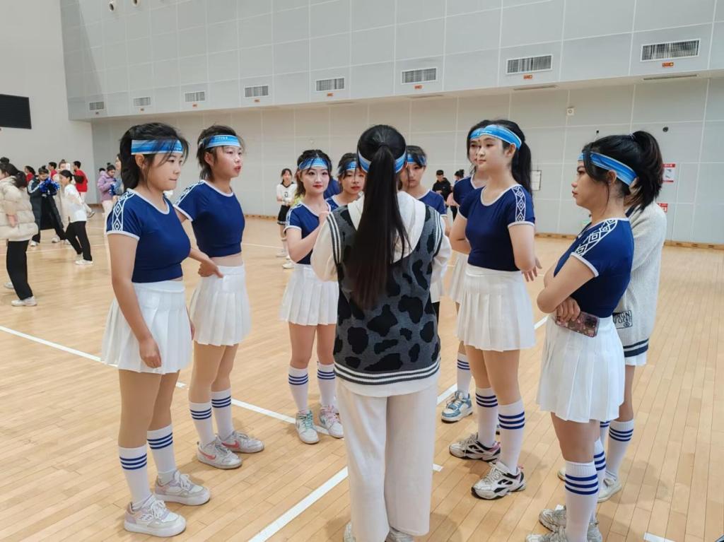 健美操参赛队员们的热情。比赛前,由教练周祈恩讲解比赛时的注意事项,并再次强调重点动作。参赛队员认真复习着比赛动作,对接下来即将进行的比赛充满信心。