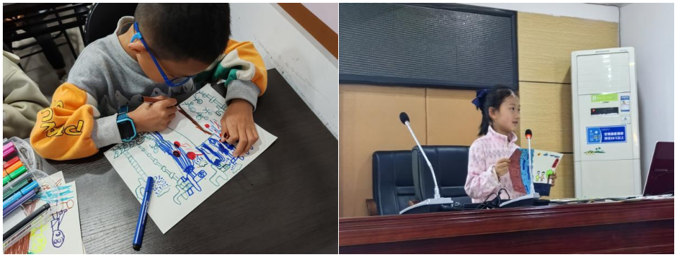 为了使理论知识更加深入人心,志愿者们还带领小朋友们绘制自救海报。孩子们运用丰富的想象力,将复杂的自救知识以生动、直观的方式融入到海报设计中。他们绘制出在不同灾害场景下的自救行为,如地震中躲避在坚固家具下方、洪水来临时攀爬至屋顶等待救援、遭遇火灾时用湿布捂住口鼻低姿逃生等。这些画面富有创意,既符合科学原理,又充满童趣,展现了他们对知识的独特理解和艺术表达能力。