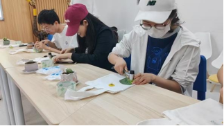 同学们在热场游戏中通过“盲盒猜叶”和“你摸我猜”两个小游戏,增加了对植物的认识,并赢得了多肉植物小奖品,现场气氛活跃。随后,主持人详细演示了拓染的“擦染法”步骤,涵盖布料预处理、植物布局、敲打拓染等步骤,并强调操作要点。