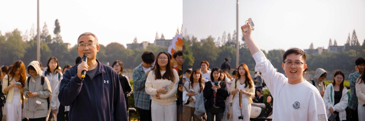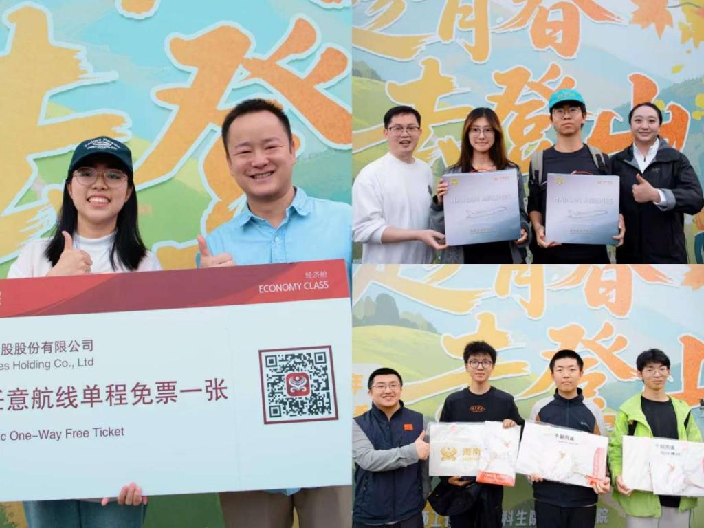 爬完山后,大家陆陆续续回到图书馆前坪。在院团委工作人员的引导下,抽奖仪式在下午17点正式开始。本次活动的奖品由海南航空赞助,一等奖为海南航空任意航线免票一张、二等奖为海南航空28cm飞机模型两架、三等奖为海南航空定制毛毡包三个。熊伊曲老师、刘文伟副总监与刘琦老师、王俊总监依次抽取奖项并为中奖同学颁奖,现场惊喜连连,欢呼不断。