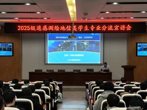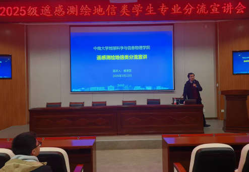 3月22日晚,2025级遥感测绘地信类专业分流宣讲会于潇湘校区地球科学楼127报告厅成功举办。地理信息系主任李海峰老师、测绘与遥感科学系主任杨泽发老师、2025级辅导员张馨心、刘洪宇老师出席,2025级遥感测绘地信类全体本科生参会。