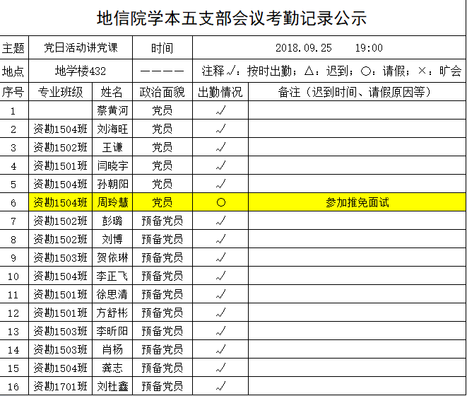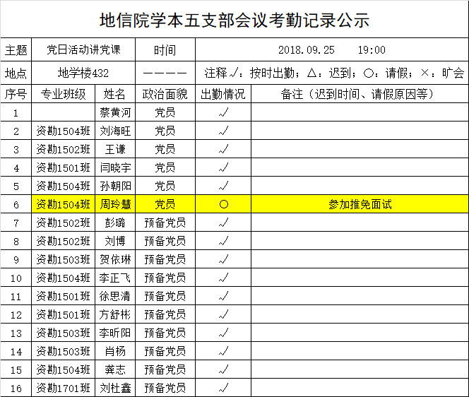 2018年9月25日明升M88 学本五支部会议考勤公示