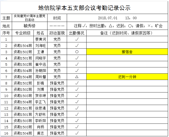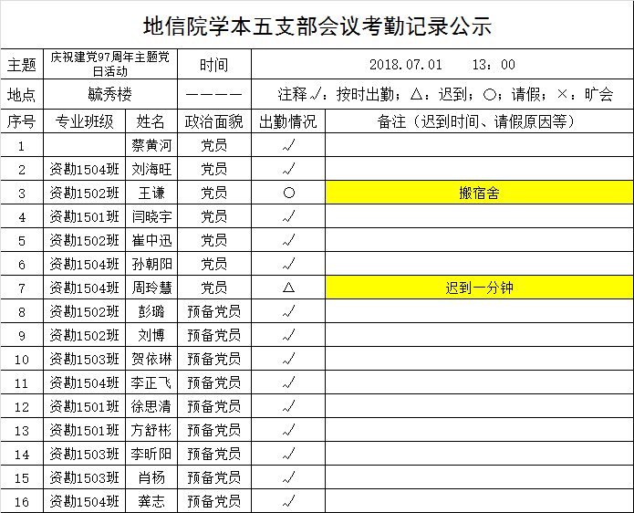 2018年7月1日明升M88 学本五支部会议考勤公示