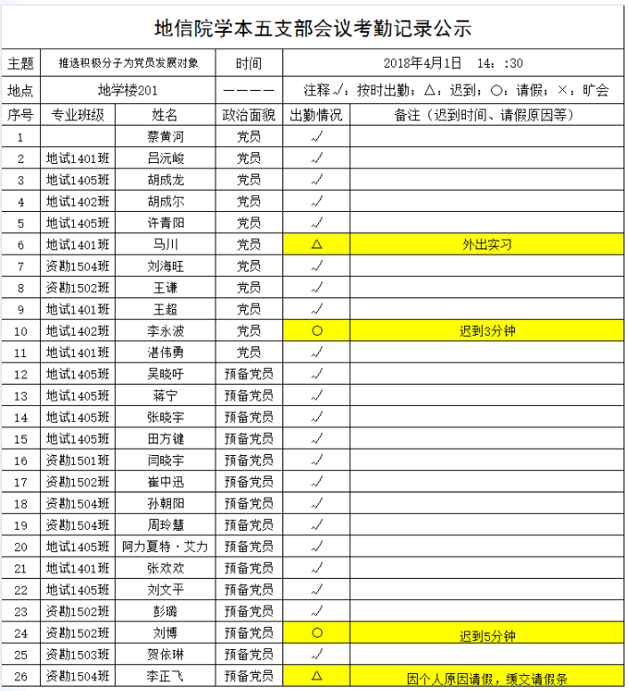 2018年4月1日下午,明升M88 学本五支部召开支部党员大会,讨论发展对象事宜。将出勤情况公示如下,接受党内外群众监督。