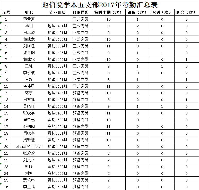 现将明升M88 学本五支部2017年度各类会议活动考勤情况汇总公示如下,接受党内外群众监督: