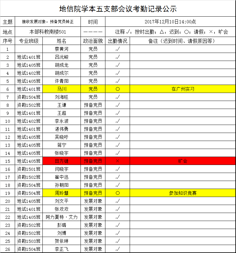 2017年12月10日明升M88 学本五支部会议考勤公示