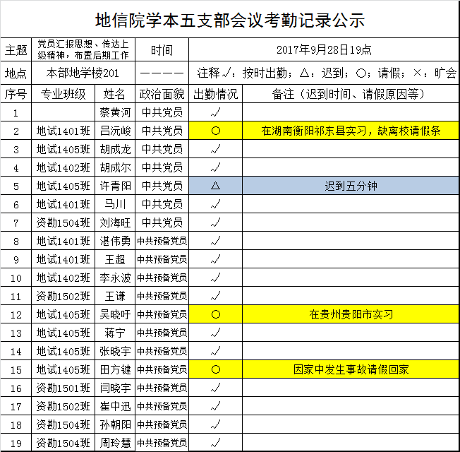 2017年9月28日明升M88 学本五支部会议考勤公示