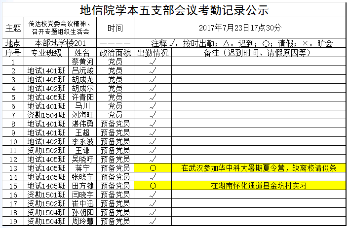 2017年7月23日明升M88 学本五支部会议考勤公示