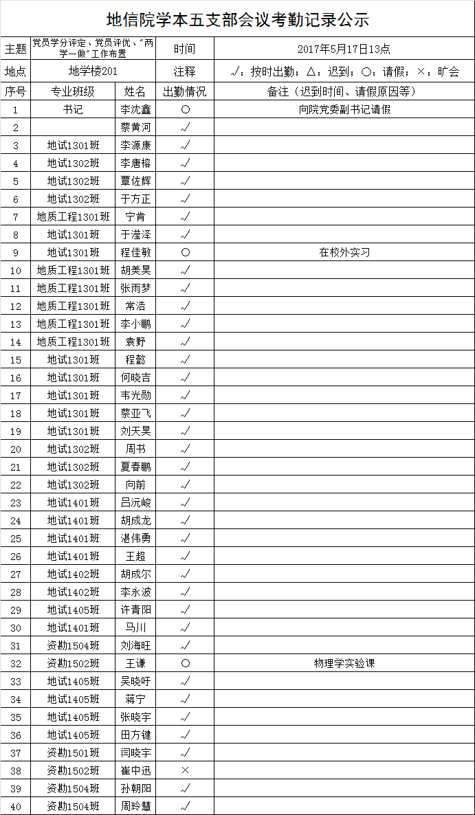 2017年5月17日中午,明升M88 学本五支部召开工作布置会。将出勤情况公示如下,接受群众监督。
