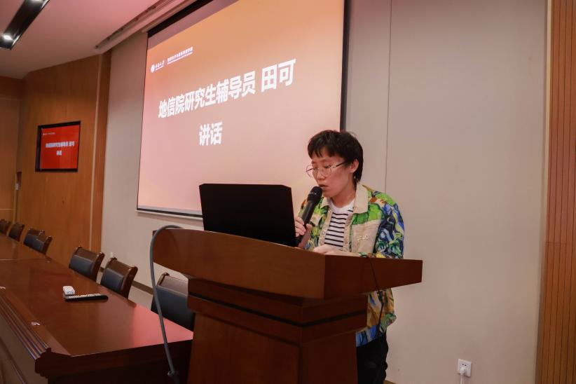 研究生辅导员田可老师上台致辞。田可老师指出,社会实践活动与共青团的发展以及广大青年之间有着密切联系,是大学生了解社会,认识国情,增长才干,增强社会责任感的重要途径。她强调此次答辩会旨在总结实践经验,帮助同学们学习实践活动,为更好地开展实践活动打下坚实基础。最后,田老师希望同学们能够牢记习近平总书记的嘱托,不负韶华,不负时代,不负人民,在青春的赛道上奋力奔跑,争取跑出当代青年的最好成绩。