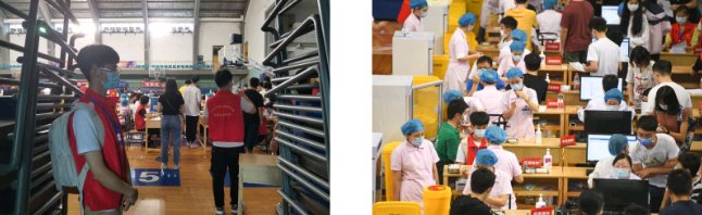 早上8:40,小队成员准时到达接种点,其后认真听取工作安排,将注意事项铭记于心。随即志愿者们合理分工、组队有序,按照提前分配的区域有序站好,为接种疫苗服务做好准备,时刻保障着疫苗接种工作的顺利进行。上午9:00,疫苗接种工作正式开始。在接种点现场,志愿者们各司其职、恪尽职守。有的守候在入口处,核对接种人员身份并测量其体温;有的穿插在排队区,负责引导队伍并检查接种人员是否完成相关信息的录入;有的站立于接种区前,负责及时疏散队伍,引导进入室内的学生以及教职工人员到相应的接种台接种;有的在观察区来回走动,细心观察是否有同学出现不良反应;还有的留守在出口处,确保每一位接种人员都已留观半小时,能够安全离开场馆。每个流程都有相关志愿者进行服务、引导,以确保接种人员能够顺利进入每一个区域,有序的接种工作陆续进行着。