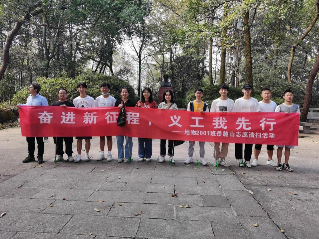为庆祝中国共产党第二十次全国代表大会的召开,提高同学们的社会责任感,引导同学们进行体育锻炼以迎接即将到来的体育课外测试,地物2001班于2022年10月23日上午在岳麓山组织进行志愿清扫活动。